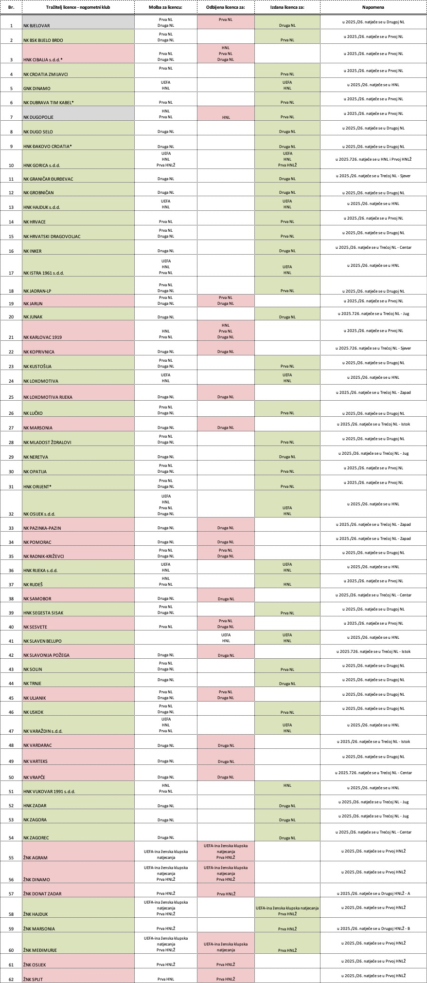 *Napomena: Licenca za HNL vrijedi i za natjecanje u Prvoj NL i Drugoj NL (čl. 16. st. 8 Općih odredaba Pravilnika)
